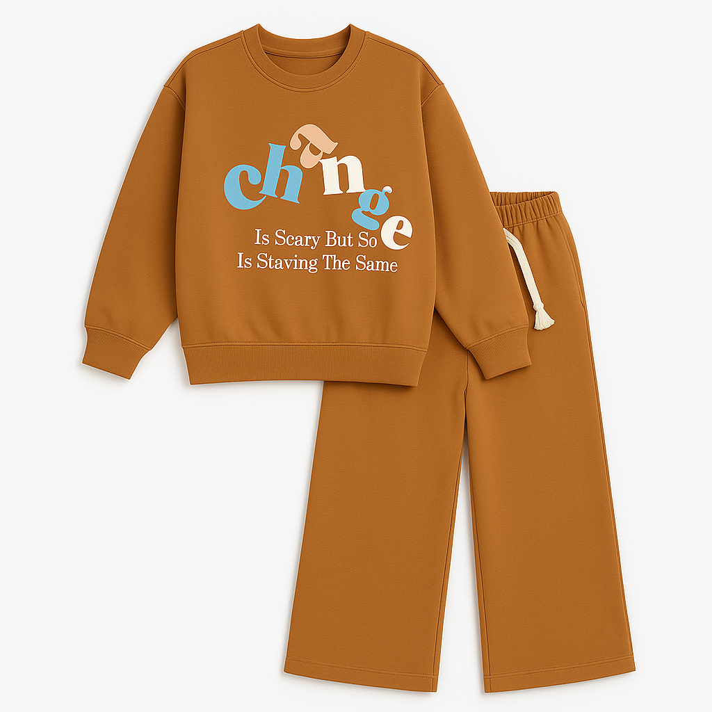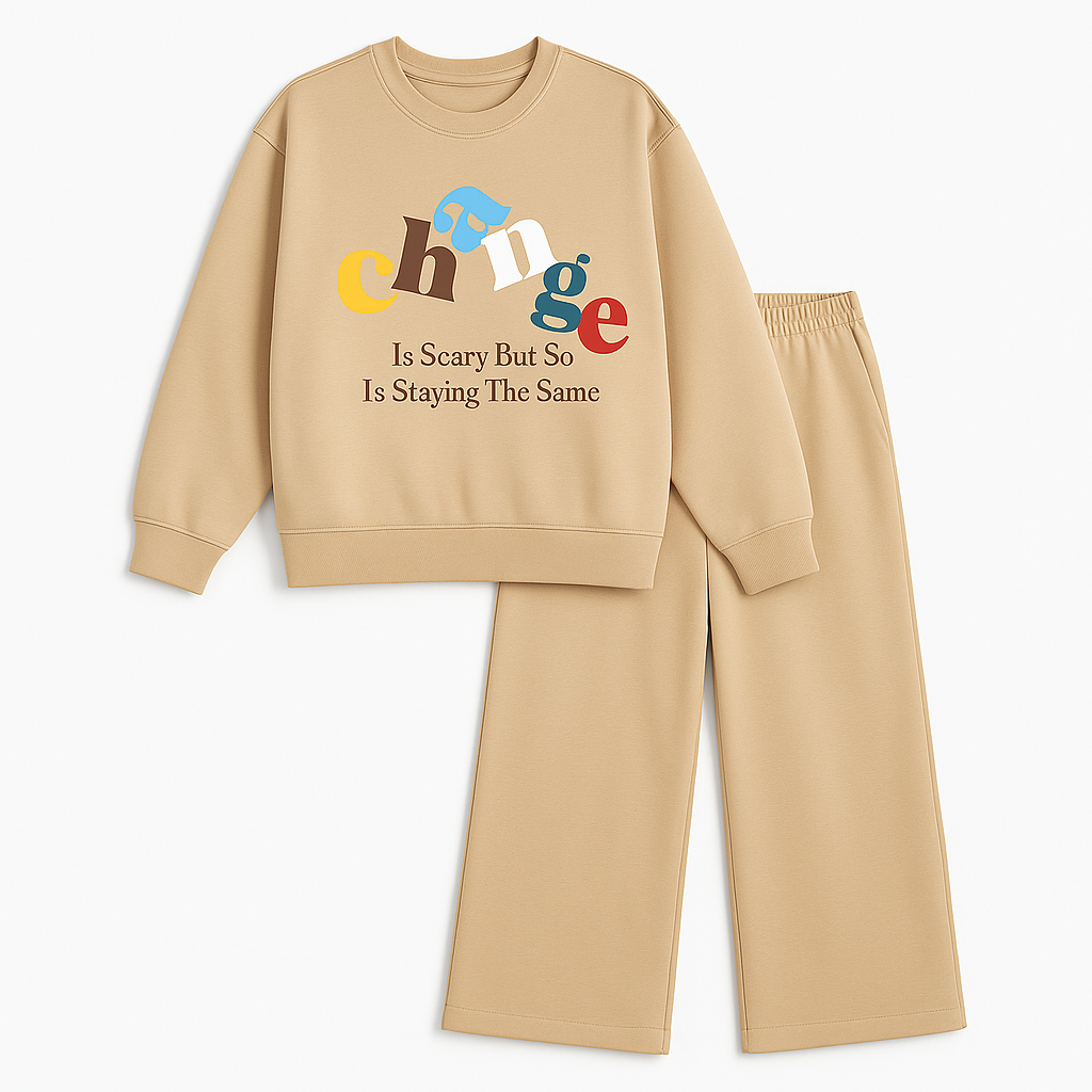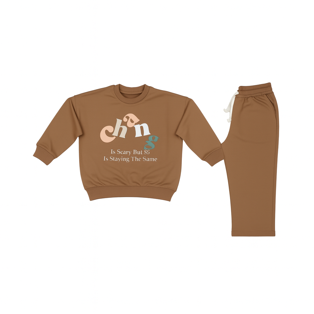 جنس پارچه از پنبه پشت دروس انتخاب شده که ضمن ایجاد حس لطافت روی پوست کودک، گرمای مناسبی برای استفاده در فصلهای سرد سال مانند پاییز و زمستان فراهم میآورد. چاپ کلمه “CHANGE” با طراحی گرافیکی خاص در قسمت جلوی بلوز، جلوهای شیک و مینیمال به این ست بخشیده است.