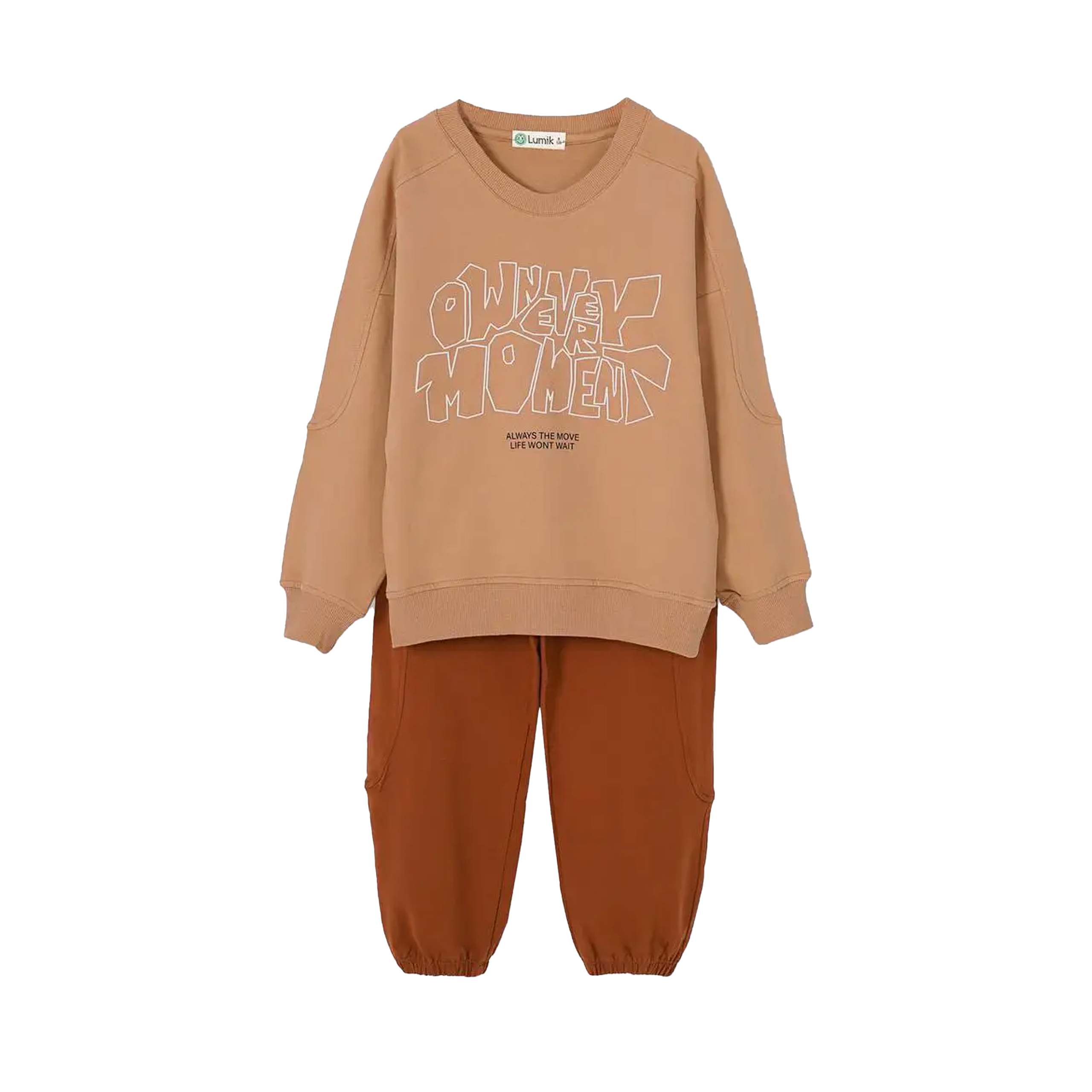 ست بلوز و شلوار Lumik بچگانه طرح مومنت انتخابی متفاوت و خاص برای پسر بچههای شیکپوش است که علاوه بر راحتی، به استایل و طراحی لباس اهمیت میدهند. این ست با رنگ گرم و پاییزی، طراحی گرافیکی خاص و شعار الهامبخش “Always the Move, Life Won’t Wait” روی بلوز، جلوهای مدرن و متفاوت به استایل کودک شما میبخشد.