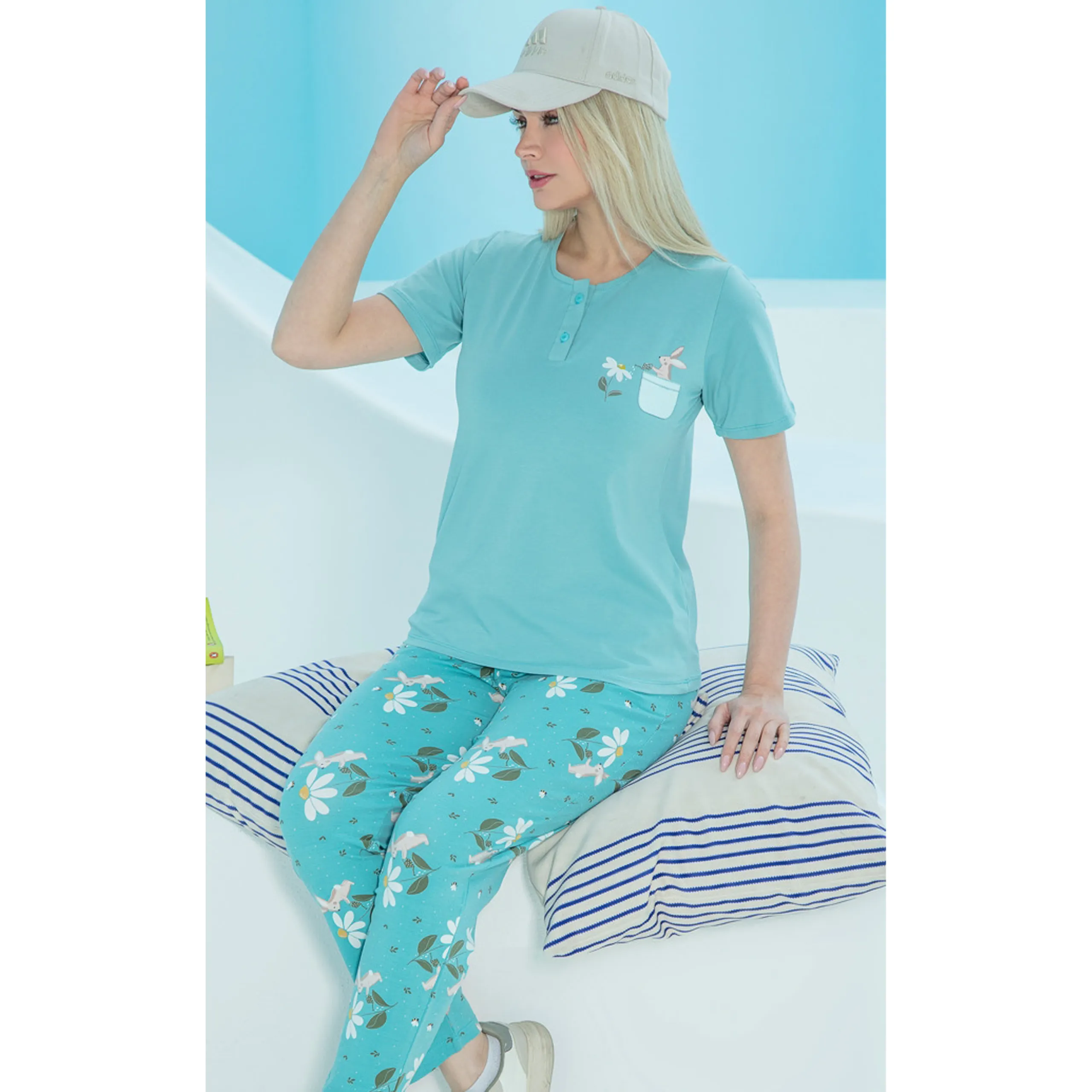 ست زنانه تی شرت و شلوار چاپدار سبز آبی بلکس